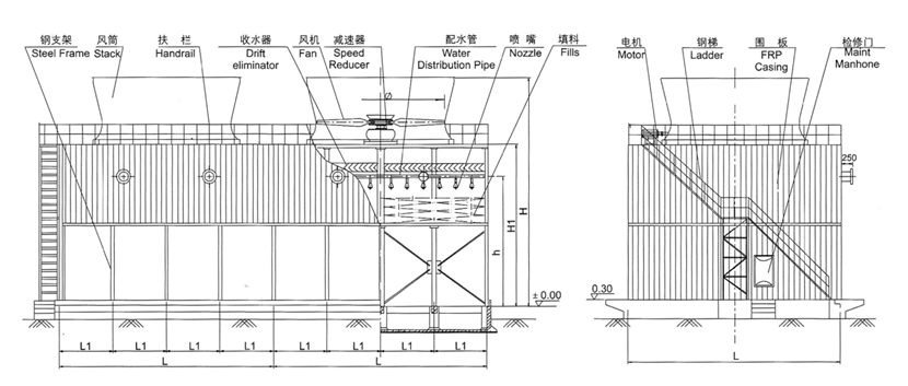 8、 配有上塔扶梯、風機檢修平臺、塔內檢修通道等,保證冷卻塔的全天候運行和正常的維護管理;